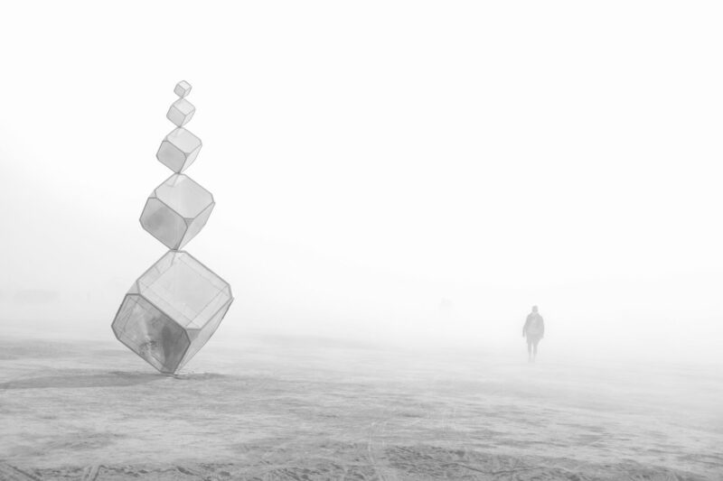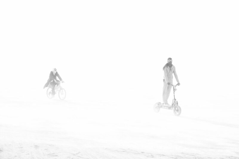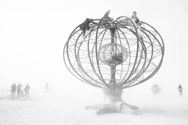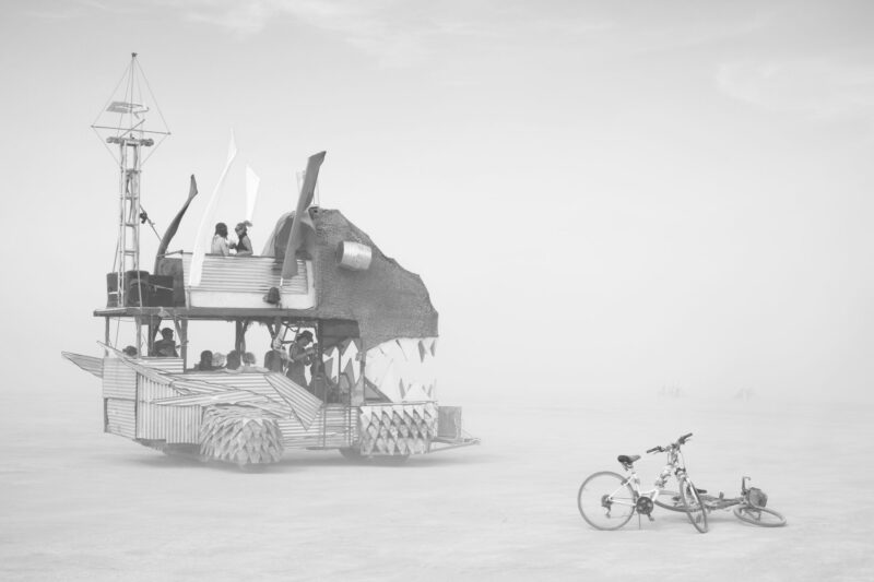 When attending Burning Man in 2014, I took the opportunity to wander around “la playa” – what the mid-center festival area in the desert is called – during a sandstorm with the intention to capture surreal moments. The sandstorm limited the distance of vision, similar to what mist does, resulting in a white-transparent gradient according to distance. As a result, I captured studio-like images on location, that appear as if they were shot in front of a plain white backdrop in a photo studio or on set at big productions.